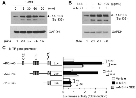 Effect of SEE on the inhibition of α-MSH-induced MITF promoter activity. (A) B16F10 cells were treated with 100 nM α-MSH for various times (0–120 min), and cell lysates were subjected to immunoblotting using an antibody against phospho-cAMP response element-binding protein (CREB) (Ser133). The glyceraldehyde 3-phosphate dehydrogenase (GAPDH) level was examined as an internal control. (B) B16F10 cells were treated with either vehicle (DMSO) or SEE (50 or 100 μg/mL) for 30 min, followed by stimulation with 100 nM α-MSH. After 30 min, cell lysates were subjected to immunoblotting using an antibody against phospho-CREB (Ser133). The GAPDH level was examined as an internal control. The intensity of the bands was quantified using ImageJ and the relative p-CREB intensity was normalized to that of GAPDH and visualized in the blot. pC/G, p-CREB/GAPDH. (C) B16F10 cells were transfected with 0.2 µg of a series of 5′-deletion constructs of the MITF gene promoter reporter plasmids. Forty-eight hours later, the cells were treated with either vehicle (DMSO), 100 nM α-MSH, or α-MSH plus 50 μg/mL SEE for 8 h, and the luciferase activities were measured. The data shown represent the mean ± SD (n = 3). **** p < 0.0001; ns, not significant.