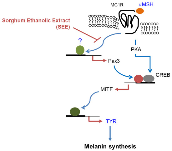 Hypothetical mode of action of SEE on the suppression of α-MSH-induced pigmentation in murine B16F10 melanoma cells. When α-MSH binds to MC1R on the surface of melanocytes, PKA is activated and induces MITF expression via CREB phosphorylation, leading to upregulation of melanogenic enzymes, including tyrosinase. In B16F10 melanoma cells, α-MSH can upregulate the Pax3 expression, which then stimulates MITF gene transcription. SEE inhibits α-MSH-induced Pax3 expression, resulting in the suppression of MITF-mediated TYR expression in B16F10 cells. αMSH, α-melanocyte-stimulating hormone; MC1R, melanocortin 1 receptor; PKA, protein kinase A; CREB, CRE-binding protein; MITF, microphthalmia-associated transcription factor; SEE, sorghum ethanolic extract.