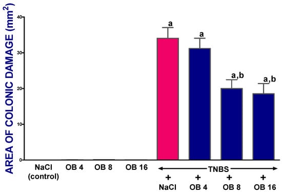 Effect of saline (NaCl) or obestatin given at doses of 4 nmol/kg (OB4), 8 nmol/kg (OB8), or 16 nmol/kg (OB16), and induction of trinitrobenzene sulfonic acid (TNBS)-induced colitis on the area of colon mucosal damage. Mean ± standard error of the mean (SEM). n = 10 in each group of animals. a p < 0.05 when compared with control; b p < 0.05 when compared with colitis + NaCl.