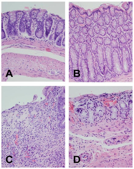 Inflammatory bowel disease (IBD) is a chronic and relapsing disease, and is an important clinical problem. IBD is characterized as the chronic dysregulation of the mucosal immune system in the gastrointestinal tract; however, its pathogenesis is still unclear. To investigate the mechanism, pathophysiology, and new methods of treatment of IBD, various animal models of experimental colitis were developed [,,]. TNBS-induced models of colitis, typical for Crohn’s disease, result in inadequate cell-mediated immune response, and acute Th1 inflammation, which includes a dense colonic tissue infiltration by cluster of differentiation 4 (CD4) T cells, and the release of numerous potent pro-inflammatory agents. Clinical manifestations of acute colitis in animals include inconsistent stool formation, occult, or even bloody diarrhea, loss of body weight, piloerection of fur, decreased movements of the animals, and death [].