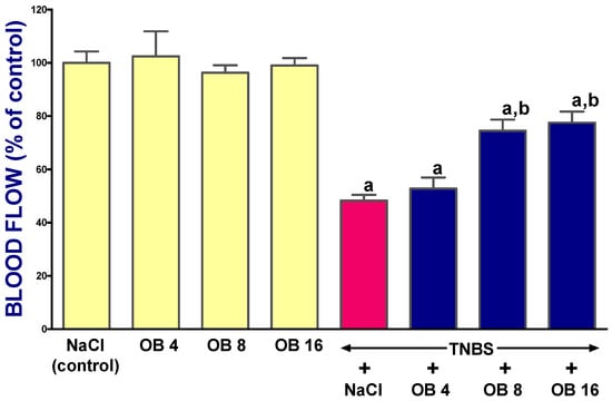 Effect of saline (NaCl) or obestatin given at doses of 4 nmol/kg (OB4), 8 nmol/kg (OB8), or 16 nmol/kg (OB16), and induction of TNBS-induced colitis on mucosal blood flow in the colon. Mean ± SEM. n = 10 in each group of animals. a p < 0.05 when compared with control; b p < 0.05 when compared with colitis + NaCl.