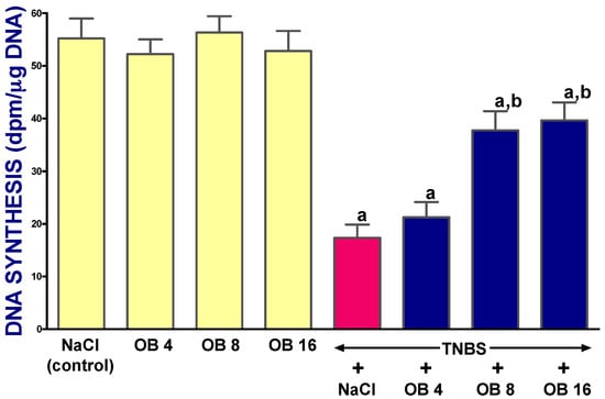 Effect of saline (NaCl) or obestatin given at doses of 4 nmol/kg (OB4), 8 nmol/kg (OB8), or 16 nmol/kg (OB16), and TNBS-induced colitis on mucosal DNA synthesis in the colon. Mean ± SEM. n = 10 in each group of animals. a p < 0.05 when compared with control; b p < 0.05 when compared with colitis + NaCl.