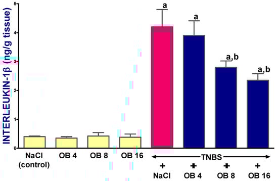 Effect of saline (NaCl) or obestatin given at doses of 4 nmol/kg (OB4), 8 nmol/kg (OB8), or 16 nmol/kg (OB16), and TNBS-induced colitis on mucosal concentration of interleukin-1β (IL-1β) in the colon. Mean ± SEM. n = 10 in each group of animals. a p < 0.05 when compared with control; b p < 0.05 when compared with colitis + NaCl.