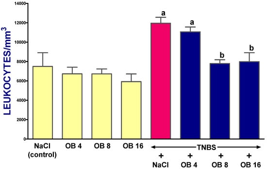 Effect of saline (NaCl) or obestatin given at doses of 4 nmol/kg (OB4), 8 nmol/kg (OB8), or 16 nmol/kg (OB16), and induction of TNBS-induced colitis on the number of blood leukocytes. Mean ± SEM. n = 10 in each group of animals. a p < 0.05 when compared with control; b p < 0.05 when compared with colitis + NaCl.