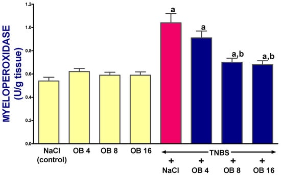 Effect of saline (NaCl) or obestatin given at doses of 4 nmol/kg (OB4), 8 nmol/kg (OB8), or 16 nmol/kg (OB16), and induction of TNBS-induced colitis on myeloperoxidase activity in colonic mucosa. Mean ± SEM. n = 10 in each group of animals. a p < 0.05 when compared with control; b p < 0.05 when compared with colitis + NaCl.