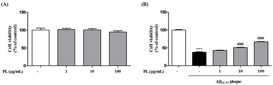 We first checked the cytotoxicity of PL in HT22 cells. Treatment with PL at 1, 10, and 100 μg/mL for 24 h did not show toxicity to HT22 cells (Figure 2A). To investigate whether PL protects neuronal cells from Aβ25–35 plaque, HT22 cells were treated with Aβ25–35 plaque in the presence or absence of PL for 24 h. After exposure to Aβ25–35 plaque, cell viability was significantly decreased to 37.69 ± 1.21% compared with the control group, whereas PL at 10 and 100 μg/mL significantly restored cell viability to 50.60 ± 1.08% and 66.61 ± 1.00%, respectively (Figure 2B).