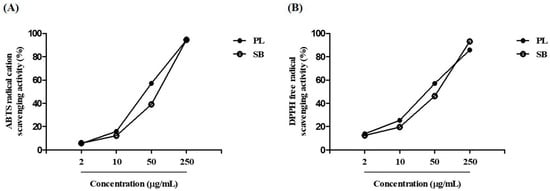 Radical scavenging activity of PL. (A) 2,2-azinobis-(3-ethyl-benzthiazolin-6-sulphonic acid) (ABTS) radical cation and (B) 2,2-diphenyl-2-picrylhydrazyl (DPPH) free radical scavenging activities at concentrations of 2–250 μg/mL. SB, Scutellaria baicalensis.