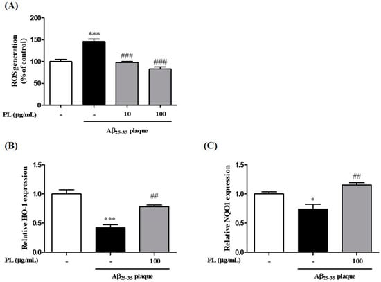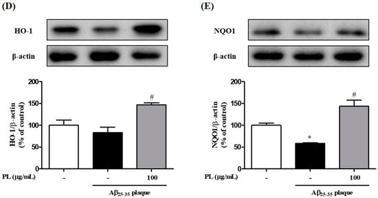 We then investigated whether PL inhibits the increase of Aβ25–35 plaque-induced intracellular ROS levels in HT22 cells. Aβ25–35 plaque significantly increased ROS levels by 145.84 ± 5.23% compared with the control group. As shown in Figure 4A, this increase was reduced by pretreatment with PL in HT22 cells in a concentration-dependent manner (10 μg/mL: 98.01 ± 2.27%; 100 μg/mL: 83.00 ± 4.81%). To explore the underlying mechanism by which PL reduced ROS levels in Aβ25–35 plaque-stimulated HT22 cells, we measured protein and mRNA expression levels of heme oxygenase-1 (HO-1) and NAD(P)H quinine dehydrogenase 1 (NQO1), which have pivotal roles in cellular antioxidant signaling [22,23]. The mRNA expression levels of HO-1 and NQO1 were decreased by Aβ25–35 plaque, but pretreatment with PL significantly ameliorated that effect (Figure 4B,C). In a parallel experiment, we analyzed the protein expression levels of HO-1 and NQO1. As with mRNA expression, PL significantly increased the protein expression levels of HO-1 and NQO1 reduced by Aβ25–35 plaque (Figure 4D,E).
