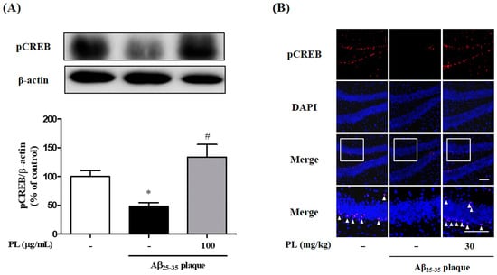ROS induced by Aβ regulates the expression of cyclic AMP response element-binding protein (CREB), which is closely related to neuronal survival, synaptic plasticity, memory function, and antioxidant systems [24,25,26]. It has been reported that antioxidant defense systems attenuated ROS-mediated damage of neuronal cells [26]. We evaluated whether PL treatment activates CREB signaling. Aβ25–35 plaque decreased phosphorylation of CREB in HT22 cells compared with the control group. PL at 100 μg/mL significantly reversed this phenomenon (Figure 5A). Next, to confirm the in vitro results, we also investigated expression of pCREB in the dentate gyrus (DG) of Aβ25–35 plaque-injected mice using immunofluorescence analysis. Aβ25–35 plaque-induced decline of pCREB expression was prevented by PL administration (Figure 5B). These findings suggest that PL decreased Aβ25–35 plaque-induced intracellular ROS accumulation via upregulation of pCREB and antioxidant enzymes.