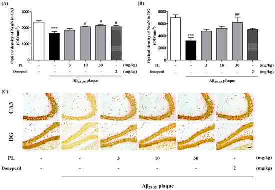 Effect of PL on neuronal cell loss in Aβ25–35 plaque-injected mice. After stereotaxic injection of Aβ25–35 plaque, mice were treated with vehicle, PL, or donepezil for 17 days. Neuronal cells were stained with anti-NeuN antibody. The optical density of the NeuN-stained cells was measured in the (A) CA3 and (B) DG; (C) Representative images of NeuN-positive neurons in the CA3 (up) and DG (down) of mice brain. Scale bar = 30 μm. Values are mean ± standard error of the mean. *** p < 0.001 vs. sham group; # p < 0.05 and ## p < 0.01 vs. Aβ25–35 plaque group. Donepezil was used as a positive control.
