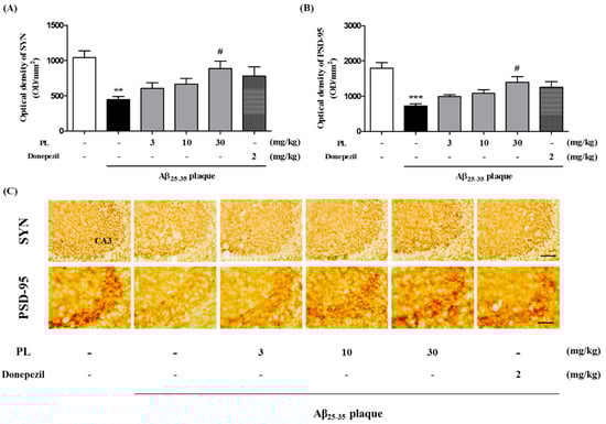 Effect of PL on synaptotoxicity in Aβ25–35 plaque-injected mice. After stereotaxic injection of Aβ25–35 plaque, mice were treated with vehicle, PL, or donepezil for 17 days. Synapses were stained with anti-SYN antibody or anti-PSD-95 antibody. The optical density of the SYN (A) and PSD-95 (B) were measured in the CA3; (C) Representative images of SYN (up) and PSD-95 (down) in the CA3 of mice brain. Scale bar = 30 μm. Values are mean ± standard error of the mean. ** p < 0.01 and *** p < 0.001 vs. sham group; # p < 0.05 vs. Aβ25–35 plaque group. Donepezil was used as a positive control.