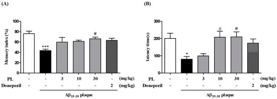 Effect of PL on memory impairment induced by Aβ25–35 plaque in mice, as measured by (A) novel object recognition test (NORT) and (B) passive avoidance test (PAT) (n = 7–8 per group). Values are mean ± standard error of the mean. * p < 0.01 and *** p < 0.001 vs. sham group; # p < 0.05 vs. Aβ25–35 plaque group. Donepezil was used as a positive control.
