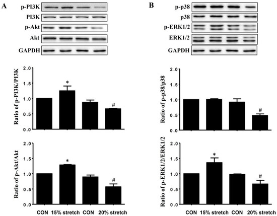 2.2. Effects of Cyclic Mechanical Stretch on the Expressions and Activities of PI3K/Akt and MAPKs (p38 and ERK1/2) in L6 Myoblasts