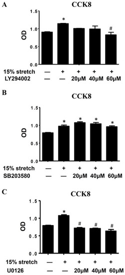 2.3. Pro-Proliferative Effect of 15% Mechanical Stretch on L6 Myoblasts Was Reversed by PI3K/Akt and ERK1/2 Inhibitors Rather Than p38 Inhibitor