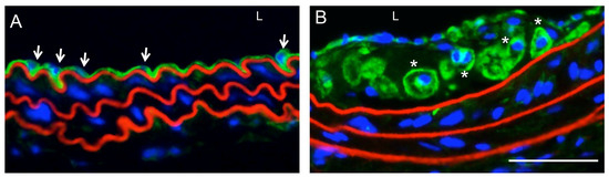 Panx1 expression in healthy and atherosclerotic arteries. (A) Panx1 (in green) is expressed in ECs (arrowheads) separating the arterial wall from the lumen (L) of a healthy mouse carotid artery; (B) Panx1 is found in lipid-laden macrophages (asterisks) present in atherosclerotic lesions. Of note, Panx1 is absent from the SMC-rich media of non-diseased and diseased conduit arteries. Nuclei are stained with DAPI (in blue) and elastic laminae are counterstained with Evans Blue (in red). Scale bar represents 25 μm.