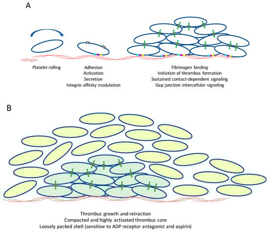 Platelets provide a front line of defense in response to injury, triggering haemostasis at sites of injury, and are increasingly recognized for their involvement in a range of other (patho)physiological processes, including inflammation, atherogenesis, and cancer cell metastasis. Platelets adhere to collagens that are exposed at sites of arterial damage, initially via an indirect interaction with plasma von Willebrand factor (VWF), which through binding to the platelet glycoprotein (GP) Ib-V-IX receptor complex, a short-lived interaction that therefore serves to slow platelets, allows subsequent direct binding to platelet collagen receptors GPVI and integrin α2β1 (Figure 2A) [155,156]. Integrin α2β1 functions principally as an adhesive receptor for collagen [157], while collagen binding to GPVI stimulates platelet activation.