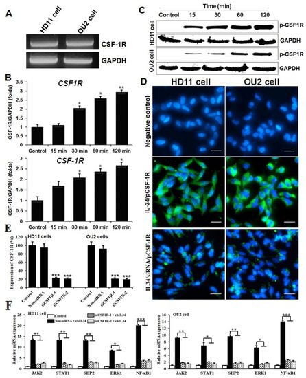 - Wang, Y.; Szretter, K.J.; Vermi, W.; Gilfillan, S.; Rossini, C.; Cella, M.; Barrow, A.D.; Diamond, M.S.; Colonna, M. IL-34 is a tissue-restricted ligand of CSF1R required for the development of Langerhans cells and microglia. Nat. Immunol. 2012, 13, 753–760. [Google Scholar] [CrossRef] [PubMed]