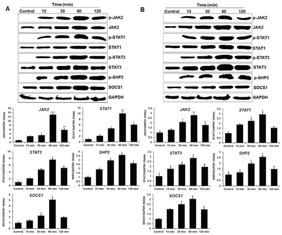 Protein (100 μg) was mixed at a 1:1 v/v ratio with 2× sample buffer (62.5 mM Tris-HCl, pH 6.8; 2% SDS; 6 M urea; 10% β-mercaptoethanol; and 20% glycerol) and heated to 100 °C for 5 min. Samples were electrophoresed on 12% Tris-glycine SDS-PAGE gels and transferred to polyvinylidene fluoride membranes (GE Healthcare, Marlborough, MA, USA). Membranes were blocked with 5% skim milk (Thermo Fisher Scientific) or 3% bovine serum albumin (BSA; Sigma-Aldrich, St. Louis, MO, USA) in PBS (pH 7.4) containing 0.05% TWEEN® 20 (PBST) for 3 h at RT. Primary antibodies (1:1000; against STAT1/3, JAK2, SOCS1, TYK2, TAK1, SHP-2, CSF-1R, NF-κB1, MyD88, ERK1/2, and glyceraldehyde-3-phosphate dehydrogenase [GAPDH]) were prepared in either 2% skim milk or 0.5% BSA in PBST overnight at 4 °C. Membranes were washed with PBST and treated with the HRP-linked anti-rabbit secondary antibodies (1:4000; Sigma-Aldrich) or goat anti-mouse IgG HRP conjugate (1:4000; Thermo Fisher Scientific) in 2% skim milk or 0.5% BSA in PBST for 2 h at RT. Subsequently, the membranes were developed using western Lightning® Plus-ECL (Thermo Fisher Scientific) on Hyperfilm™ (GE Healthcare).