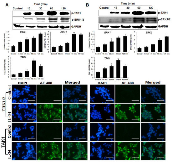 The ERK1/2 MAPK signaling pathway regulates cell proliferation, differentiation, and transformation [26]. Previous reports demonstrated that human IL-34 regulated the ERK1/2 MAPK signaling pathway and induced cytokine production [27,28,29]; therefore, we investigated whether chIL-34 affected two major MAPK pathway-related genes, p-ERK1/2 (Thr202/Tyr204), and p-mitogen-activated protein kinase kinase kinase 7 (TAK1) (Ser933) in the chicken cell lines using western blotting, qRT-PCR, and immunocytochemical staining (Figure 3). Compared with the unstimulated controls, the chIL-34-treated (200 ng/mL) cell lines had higher levels of p-ERK1/2 after 15 min, which reached maximum levels by 120 min (Figure 3). Similarly, chIL-34 strongly induced p-TAK1 (Ser933), with maximal induction after 60 min (Figure 3). We found by qRT-PCR and immunocytochemical staining that p-ERK1/2 (Thr202/Tyr204) and TAK1 (Ser933) proteins (visualized as green fluorescence) were strongly upregulated in the cytoplasm after treatment with chIL-34 for 60 min, as compared to controls, and that mRNA expression was highly increased after 60 min, particularly in the HD11 cell line (Figure 3). These results indicate that chIL-34 increases the expression and alters the subcellular localization of p-ERK1/2 (Thr202/Tyr204) and TAK1 (Ser933).