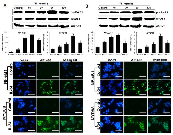 NF-κB is a protein complex that plays an important role in the regulation of transcription, cytokine production, cell survival, cellular responses, and immune responses to infection [30]. To explore if NF-κB signaling pathways are activated in chicken HD11 and OU2 cell lines treated with recombinant chIL-34, we evaluated p-NF-κB1 (Ser192) and MyD88 expression by western blot and immunocytochemical staining with phospho-specific antibodies and qRT-PCR. The p-NF-κB1 (Ser192) and MyD88 antibodies displayed a similar staining pattern in the cells after treatment with chIL-34 (Figure 4). NF-κB1 (Ser192) and MyD88 expression reached maximum levels after 60 min of treatment, as indicated by western blotting, in both cell lines. These genes were significantly induced by 17.45- and 2.96-fold (NFKB1), and 5.45- and 4.84-fold (MYD88) in the HD11 and OU2 cell lines, respectively (Figure 4). Moreover, the expression levels of p-NF-κB1 (Ser192) and MyD88 protein (green) were strongly increased by chIL-34 in the nucleus or cytoplasm compared with the expression in untreated cells. These results suggested that chIL-34 regulates the expression and subcellular localization of p-NF-κB1 (Ser192) and MyD88 and indicated that chIL-34 activates NF-κB1 and MyD88 signaling in chicken cell lines.