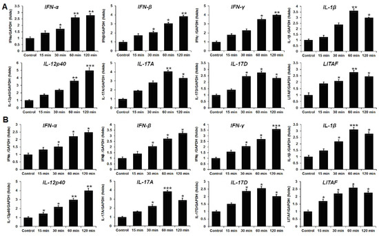 To determine cytokine gene expression in HD11 and OU2 cell lines, qRT-PCR was performed following recombinant chIL-34 treatment. The expression levels of cytokine genes in the HD11 and OU2 cell lines with and without treatment are shown in Figure 5. When the HD11 macrophage cell line was co-cultured with chIL-34 protein, the expression levels of the Th1-type cytokines IFN-α, IFN-β, IFN-γ, and IL-1β were significantly increased, particularly after 60 or 120 min of treatment (Figure 5A). We also examined the effects of chIL-34 on the pro-inflammatory mediator lipopolysaccharide-induced tumor necrosis factor (TNF) factor (LITAF); LITAF was upregulated by 2.74-fold in the HD11 cell line after treatment with chIL-34 for 60 min (Figure 5A). Moreover, Th17-type cytokine genes, including IL-12p40, IL-17A, and IL-17D, were highly upregulated in the HD11 cell line by 4.97-, 4.0-, and 2.73-fold, respectively, following chIL-34 treatment (Figure 5A). In addition, we investigated the expression of Th1 and Th17 cytokines in the OU2 cell line following treatment with chIL-34 protein. The results were similar to those in the HD11 cell line (Figure 5B); however, gene expression in HD11 cells was generally higher than in OU2 cells (Figure 5).