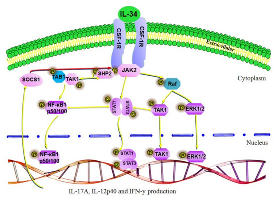In summary, this is the first report to describe the signal transduction downstream of chIL-34. Our results showed that chIL-34 activates JAK2, tyrosine kinase 2 (TYK2), STAT1/3, NF-κB, and MAPK signaling pathways through CSF-1R signaling, which upregulates the expression of pro-inflammatory cytokines in chicken macrophage and fibroblast cell lines. In conclusion, our findings demonstrate the role of chIL-34 in controlling Th1 and Th17 pro-inflammatory gene transcription via multiple signaling pathways.
