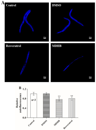 Effect of MDHB on lipofuscin accumulation of wild-type C. elegans. (A) Typical fluorescence images of worms in untreated control, Dimethyl sulfoxide (DMSO)-treated, resveratrol-treated and MDHB-treated worms are shown. (B) Effect of MDHB on intracellular lipofuscin accumulation in wild-type C. elegans at day 10. Fluorescence intensities of the lipofuscin fluorescence of 30 worms from different groups were analyzed by the ImageJ soft. Data are shown as means ± S.E.M comparing to the untreated control (OD-background/mm2 = 465.32 ± 31.56; set to 1). Statistical significance of differences between treated and control groups were described significant at ** p < 0.01 by one-way ANOVA with LSD post hoc test. ANOVA, analysis of variance. This experiment was performed three times.
