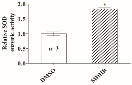 Effect of MDHB on superoxide dismutase (SOD) activity of wild-type C. elegans. Error bars represent the standard deviations (SD), and differences between the DMSO (control) and MDHB groups were described significant at * p < 0.05 by one-way ANOVA. This experiment was performed thrice.
