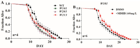 MDHB might extend the lifespan of wild-type C. elegans via the W06A7.4 gene [13]. Therefore, three W06A7.4 gene loss-of-function strains (W101, W203, and W213) were used to investigate the relationship between the W06A7.4 gene and the pro-longevity action of MDHB in worms. It was found that wild-type worms (15.47 ± 0.118 days) lived longer than W101 strains (13.30 ± 0.240 days, p < 0.05), W203 strains (13.01 ± 0.260 days, p < 0.05), and W213 strains (13.78 ± 0.270 days, p < 0.05) (Figure 4A and Table 1). However, our results show that exposure to MDHB extended the lifespan of all three W06A7.4 loss-of-function mutants (W101, W203, and W213 strains) (Figure 4B–D and Table 1), but the percentage change caused by MDHB was less than that in wild-type worms (Figure 4E and Table 1). Thus, we report that the longevity action of MDHB may partly require W06A7.4, and partial MDHB-induced longevity is independent of the W06A7.4 gene in worms.