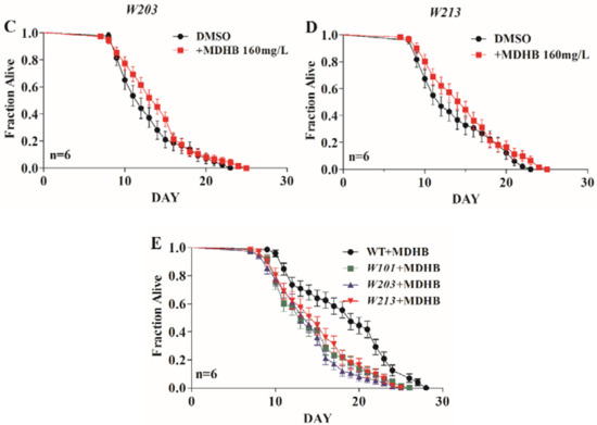 Effects of MDHB on the mean lifespan of W06A7.4 loss-of-function mutations (W101, W203, and W213 strains). (A) Survival of the three W06A7.4 mutations (W101, W203, and W213) compared to wild-type animals. The mutated worms (W101, W203, and W213) had shorter lifespans than the wild-type N2 worms, p < 0.05. (B–D) Survival of mutated worms with W06A7.4 gene knocked out, with and without MDHB treatment. Treatment with MDHB notably enhanced mean lifespan of three W06A7.4 loss-of-function mutants, W101 (+11.6%, p < 0.05), W203 (+7.9%, p < 0.05), and W213 (+9%, p < 0.05). (E) Survival of three W06A7.4 loss-of-function mutations (W101, W203, and W213 strains) and wild-type animals exposed to MDHB. Data are represented as mean ± S.E.M; statistical details are summarized in Table 1.