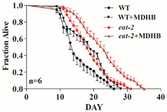 Among the numerous factors that regulate lifespan, caloric restriction (CR) is recognized as an indisputable environmental modulator of lifespan in many species, including C. elegans [23,24]. CR prolongs lifespan and can be caused by a mutation of the eat-2 gene, which plays a vital role in pharyngeal pumping [25,26]. MDHB obviously prolonged the lifespan of eat-2 (ad1113) mutations (20.4%) (Figure 5 and Table 1), suggesting that the primary mechanism of MDHB-induced longevity in worms is not caloric restriction. Besides, wild-type worms pretreated with MDHB were not nutrient-limited, as the animals did not display obvious differences in reproduction, fat storage, or somatotype (showing thin or starved) that always occur with CR [26].