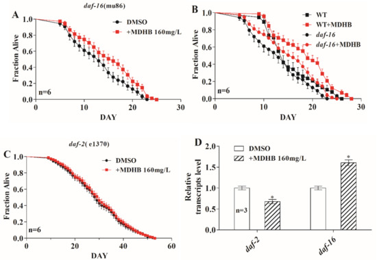 Effects of MDHB on the lifespan of daf-2 and daf-16 loss-of-function mutants. (A) Effects of MDHB on the lifespan of daf-16 (mu86) mutations. (B) Effects of MDHB on the lifespan of Wild-Type (WT) animals and daf-16 (mu86) mutants. (C) on the daf-2 (e1370) mutants. (D) Quantification of MDHB exposure on the expression levels of daf-2 and daf-16 by RT-PCR (real-time polymerase Chain Reaction) in wild-type nematodes. Error bars represent the standard deviations (SD), and differences between the DMSO (control) and MDHB groups were described significant at * p < 0.05 by one-way ANOVA. actin-1 was used as an endogenous control, and the mRNA expression were determined by real-time PCR using the 2−ΔΔCt method, * p < 0.05.