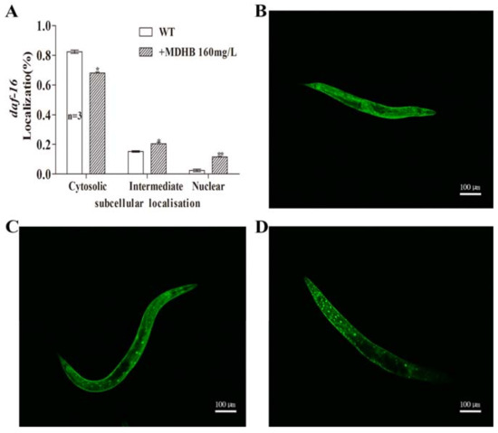 Suppressing the daf-2 signaling pathway transferred daf-16 from cytoplasm into nucleus, where it modulates the expression of genes that are known to be associated with longevity regulation and diverse cellular stress responses [16]. We visualized the effect of MDHB on daf-16 intracellular location through a specific transgenic strain (TJ356) that included the daf-16::GFP (green fluorescent protein) reporter construct integrated in the genome. Exposure to 160 mg/L MDHB induced 11.5% nuclear accumulation of daf-16::GFP in nuclei, but only 2.4% in worms in the untreated control groups (Figure 7), suggesting that MDHB might act upstream of daf-16 and enhance its nuclear translocation. These results strongly indicate that daf-16 is an indispensable part of the action of MDHB-induced promotion of antioxidant ability in nematodes, similar to other phenolic antioxidants.
