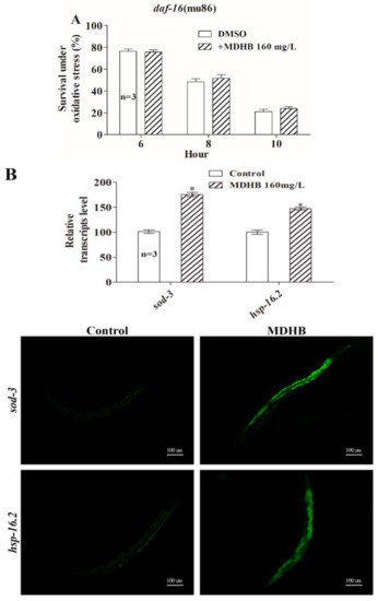 Aging has been related to oxidative stress resistance, and various studies have proved that lifespan modulation affects resistance to oxidative stress [19]. Accordingly, we performed an oxidative stress resistance assay to analyze the effects of MDHB on oxidative stress, and our studies showed that MDHB protected wild-type animals against oxidative damage, while it did not extend mean lifespan of daf-16 (mu86) loss-of-function mutations (p > 0.05) under oxidative stress. This finding indicates that daf-16 leads to the protective effect of MDHB in worms. Moreover, worms pretreated with MDHB showed enhanced daf-16 nuclear translocation and promoted expression of GFP guided by hsp-16.2 or sod-3, which functions downstream of daf-16. sod-3 is a typical scavenger enzyme of ROS in oxidative stress, and it catalyzes the disproportionation of active superoxide anions to molecular oxygen. One explanation is that the actions of MDHB are modulated, at least partially, by activating hsp-16.2 and sod-3 genes that are positively related to lifespan regulation and stress resistance. We suggest that a readjustment of MDHB on daf-16 leads to the verified antioxidant effects of MDHB in C. elegans.