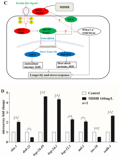 To further investigate whether the improved oxidative stress resistance of C. elegans pretreated with MDHB depends on daf-16–regulated activity, a microarray profiling analysis was used to examine the effects of MDHB on the following daf-2/daf-16 targeted genes: skn-1 [33,34], cst-1 [35], dod-22 [36], hsp-12.1, hsp-16.1, hsp-16.49 [36], mtl-1 [36], ins-18 [36], and sodh-1 [37]. The profiles of the differentially expressed genes (MDHB treatment vs. DMSO treatment, fold change >2 or <0.5) were obtained by analyzing the MDHB-regulated genes on the 6th day respectively within the three batches of the samples. The details about these genes are summarized in Table 2. 8 genes were confirmed by matching differentially expressed genes on the 6th day (Figure 8D). The corresponding functional annotations of these genes are shown in Table 2. Expression of skn-1, hsp-12.1, hsp-16.1, hsp-16.49, mtl-1 and sodh-1 was significantly increased (fold change >2, p < 0.05), while dod-22 and mtl-2 significantly decreased (fold change >2 or <0.5, p < 0.05) (Figure 8D and Table 2). Together, these results suggest that MDHB prolongs the lifespan of C. elegans at least partially through the daf-2/daf-16 pathway, which is connected to oxidative stress resistance and longevity regulation.