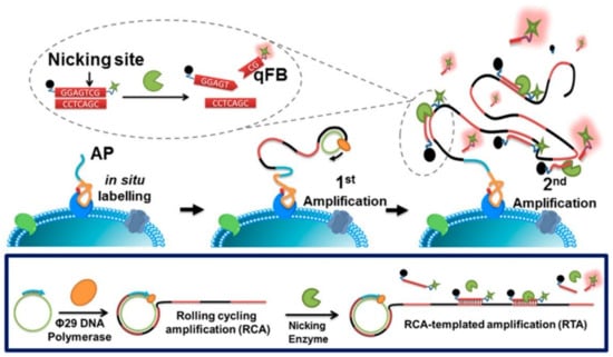 - Ali, M.M.; Li, F.; Zhang, Z.; Zhang, K.; Kang, D.K.; Ankrum, J.A.; Le, X.C.; Zhao, W. Rolling circle amplification: A versatile tool for chemical biology, materials science and medicine. Chem. Soc. Rev. 2014, 43, 3324–3341. [Google Scholar] [CrossRef] [PubMed]