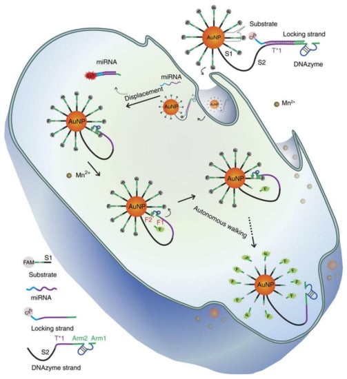 - Peng, H.; Li, X.F.; Zhang, H.; Le, X.C. A microRNA-initiated DNAzyme motor operating in living cells. Nat. Commun. 2017, 8, 14378. [Google Scholar] [CrossRef] [PubMed]