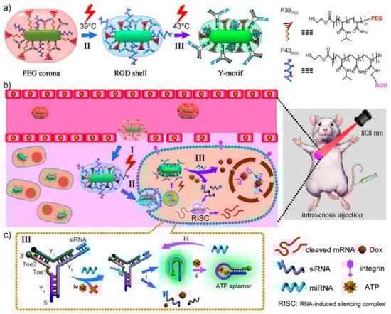- Zhang, P.; Wang, C.; Zhao, J.; Xiao, A.; Shen, Q.; Li, L.; Li, J.; Zhang, J.; Min, Q.; Chen, J.; et al. Near infrared-guided smart nanocarriers for microRNA-controlled release of doxorubicin/siRNA with intracellular ATP as fuel. ACS Nano 2016, 10, 3637–3647. [Google Scholar] [CrossRef] [PubMed]
