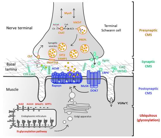 Schematic of the neuromuscular junction (NMJ) and the main molecules involved in congenital myasthenic syndromes. CMS result from presynaptic (ChAT, ChT, MUNC13-1, MYO9, PREPL, SYT2, VAChT, and VAMP1), synaptic basal lamina (COLQ and COL13A1), and postsynaptic defects (AChR subunits: α, β, δ and ε, AGRN, DOK7, MUSK, LRP4, and rapsyn). An increasing number of presynaptic CMS is being reported due to abnormalities in the synthesis, recycling or release of acetylcholine (normal arrows). The Agrin-LRP4-MuSK signaling pathway (bold arrows) is crucial for the clustering of the AChRs at the postsynaptic muscle membrane. Novel genes encoding for ubiquitous molecules (GFPT1, DPAGT1, ALG2, ALG14, and GMPPB) are represented in the endoplasmic reticulum (ER) in a simplified view of the N-glycosylation pathway. Post-translational modifications of the saccharide structure of the AChR and other NMJ proteins take place at the ER and Golgi apparatus (dashed arrows), before reaching the muscle cell surface as mature proteins. ACh, acetylcholine; AChE, acetylcholinesterase; AcCoA, acetyl coenzyme A; Ch, choline; VGNa + C, voltage-gated sodium channel.