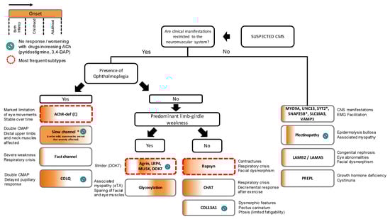 Proposed algorithm for targeted genetic screening of suspected CMS cases. Clinical evaluation should start by exploring age at onset and presence of manifestations beyond the neuromuscular boundaries. Ophthalmoplegia and limb-girdle weakness are clinically useful to guide genetic screening. Key diagnostic features are provided outside the boxes. Most frequent subtypes of CMS include AChR-deficiency, DOK7 CMS, and rapsyn CMS which stand for approximately 70% of all cases in the UK. (*) Slow channel syndrome, SYT2 CMS, and SNAP25B CMS are dominantly inherited. CNS, central nervous system; TA, tubular aggregates.