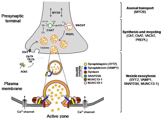 Schematic representation of the nerve terminal and the main molecules involved in presynaptic CMS. In the synaptic cleft, acetylcholinesterase (AChE) breaks down acetylcholine (ACh) into acetate and choline (Ch), which is uptaken by the sodium-dependent high-affinity choline transporter 1 (ChT) to the presynaptic terminal. The enzyme choline acetyltransferase (ChAT) catalyses the synthesis of ACh from acetyl coenzyme A (AcCoA) and choline, and the vesicular acetylcholine transporter (VAChT) loads ACh into synaptic vesicles. PREPL encodes a protein that is meant to act as an effector of the clathrin-associated adaptor protein 1 in the trafficking of VAChT []. The synaptic vesicles accumulate adjacent to the nerve terminal ready for exocytosis. Upon the arrival of an action potential, voltage-dependent Ca2+ channels open and the influx of Ca2+ cause the fusion of vesicles to the plasma membrane through the soluble N-ethylmaleimide-sensitive factor attachment protein receptor (SNARE) complex (synaptobrevin, syntaxin, and SNAP25B) and the Ca2+ sensor, synaptotagmin. Additionally, MUNC 13-1 and MUNC 18-1 (syntaxin-binding protein 1) take part in the assembly and disassembly of the complex through mechanisms still not fully understood []. Myosin-IX A is believed to be involved in axonal transport (two directions arrow). Adapted from [].