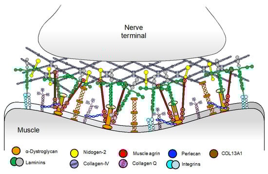 - Denzer, A.J.; Brandenberger, R.; Gesemann, M.; Chiquet, M.; Ruegg, M.A. Agrin Binds to the Nerve-Muscle Basal Lamina via Laminin. J. Cell Biol. 1997, 137, 671–683. [Google Scholar] [CrossRef] [PubMed]