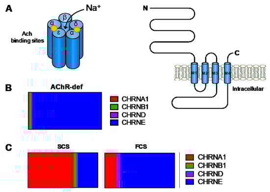 The adult AChR and the genetics of AChR-deficiency and kinetics abnormalities of the AChR. (A) The AChR is made up of five subunits organised around a central pore. Each subunit is composed of an extracellular domain, four transmembrane domains (M1–M4), and a large cytoplasmic loop that links M3 and M4; (B,C) Relative proportion of genetic defects in patients with AChR deficiency and kinetic abnormalities of the AChR within the Oxford CMS cohort. AChR deficiency is mainly caused by mutations in CHRNE encoding the ε-subunit of the AChR. SCS is often caused by mutations in CHRNA1 encoding the AChR α-subunit, while FCS is most commonly due to mutations in CHRNE.