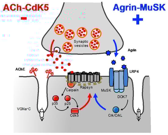 - Lin, W.; Dominguez, B.; Yang, J.; Aryal, P.; Brandon, E.P.; Gage, F.H.; Lee, K.F. Neurotransmitter acetylcholine negatively regulates neuromuscular synapse formation by a Cdk5-dependent mechanism. Neuron 2005, 46, 569–579. [Google Scholar] [CrossRef] [PubMed]