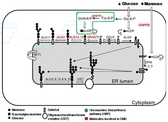 Simplified representation of the N-glycosylation pathway of proteins and the molecules involved in CMS. The N-linked glycosylation of proteins takes place in the ER. It starts with the assembly of the core glycan (N-acetylglucosamine, glucose and mannose) on the lipid dolichol. A series of cytosolic glycosyltransferases proceed to dolichol glycosylation on the cytoplasmic face of the ER: GFPT1 synthesizes UDP-GlcNAc (Uridine diphosphate N-acetylglucosamine); DPAGT1 and the ALG13/14 complex are involved in adding the first and second N-acetylglucosamine to dolichol. Additional sugar residues are added by ALG2 and other enzymes until the resulting product is flipped into the ER lumen by RFT1. Inside the ER lumen, sugar moieties are incorporated until the glycan is transferred to asparagine residues of nascent proteins by the multimeric oligosaccharyl transferase complex (OST) that subsequently will be modified inside the ER and Golgi. DOLK, dolichol kinase; DPM, dolichol-phosphate mannose synthase; Fru-6-P, fructose-6-phosphate; GlcN-6-P, glucosamine-6-phosphate; Glu-6-P, glucose-6-phosphate; GMPPB, GDP-mannose pyrophosphrylase B.