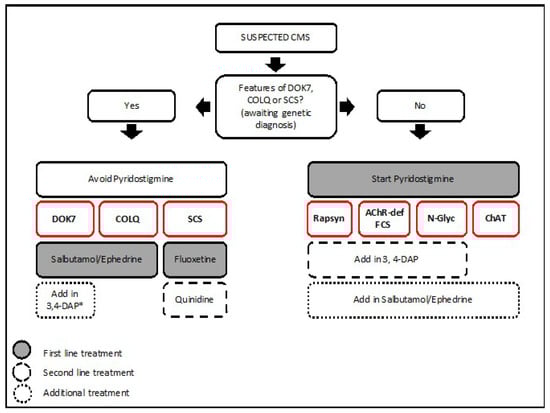 The CMS treatment strategy used in the Oxford CMS Service is provided for the most common CMS subtypes (Figure 8). As shown in the figure, genetic diagnosis is crucial to provide adequate pharmacological treatment for every CMS subtype.