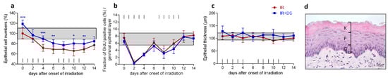 Epithelial cell numbers of untreated and unirradiated control specimen were normalized to 100%. Irradiation alone gradually reduced cell numbers until day 6. The onset of repopulation in the beginning of the second treatment week resulted in a stabilization of cell numbers throughout the rest of the treatment time (Figure 1a). Irradiation rapidly abolished proliferation, evident by a reduction of Bromodeoxyuridine BrdU-positive cell from 8% in control specimen to 0.5% on day 2. The onset of repopulation led to a recovery of normal proliferation from the second treatment week onwards (Figure 1b). Epithelial thickness, composed of the germinal-, the functional-, and the fully keratinized superficial layer (Figure 1d), was not affected by irradiation (Figure 1c). Additional DS application had no effect on epithelial BrdU incorporation but, however, increased epithelial cell numbers throughout the study period. Significantly higher cell numbers were found on day 0 (p ≤ 0.001) after DS pretreatment from day-3 onwards, on day 4 (p ≤ 0.001), day 6 (p = 0.005), day 10 (p = 0.018) and day 12 (p = 0.007). No significant effects of DS on epithelial thickness were observed throughout the study period.