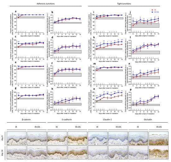 Effect of DS on irradiation-induced epithelial junctions. The relative number of adherens junction marker β-catenin and e-cadherin- (a–h) or tight junction marker claudin-1 and occludin positive epithelial cells (i–p) and their respective staining intensity were analyzed, in the germinal and functional compartments, respectively. Data points represent the mean of 5 animals, error bars indicate ±1 SD. The shaded areas illustrate the mean (±1 SD) from 5 control animals. The fractionation protocol is indicated on top of the abscissae. Histophotographs illustrate representative junction marker staining in on day 0 and after irradiation without and with DS on day 14 of the study period. * p ≤ 0.05, ** p ≤ 0.01, *** p ≤ 0.001, Scale bar = 20 µm.