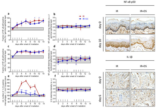 Effect of DS on irradiation-induced inflammatory changes. The relative number of NF-κB p50 positive epithelial cells and their respective staining intensity were analyzed in the germinal (a,b) and functional compartments of the lower tongue epithelium, respectively (c,d); IL-1β expression occurred exclusively in macrophages, which were scored in the deeper tongue tissue (e,f). Data points represent the mean of 5 animals, error bars indicate ±1 SD. The shaded areas illustrate the mean (±1 SD) from 5 control animals. The fractionation protocol is indicated on top of the abscissae. Histophotographs illustrate representative inflammatory marker staining on day 0 and after irradiation without and with DS without and with DS treatment on day 10 (NF-κB) and day 6 (IL-1β) of the study period. * p ≤ 0.05, ** p ≤ 0.01, *** p ≤ 0.001, Scale bar = 20 µm.
