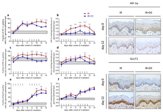 Effect of DS on irradiation-induced hypoxia. The relative number of HIF-1α positive epithelial cells and their respective staining intensity were analyzed in the germinal (a,b) and functional compartments of the lower tongue epithelium, respectively (c,d); GLUT1 expression was limited to the germinal tissue layer (e,f). Data points represent the mean of 5 animals, error bars indicate ±1 SD. The shaded areas illustrate the mean (±1 SD) from 5 control animals. The fractionation protocol is indicated on top of the abscissae. Histophotographs illustrate representative HIF-1α and GLUT1 staining on day 0 and after irradiation without and with DS treatment on day 12 of the study period. * p ≤ 0.05, ** p ≤ 0.01, *** p ≤ 0.001, Scale bar = 20 µm.